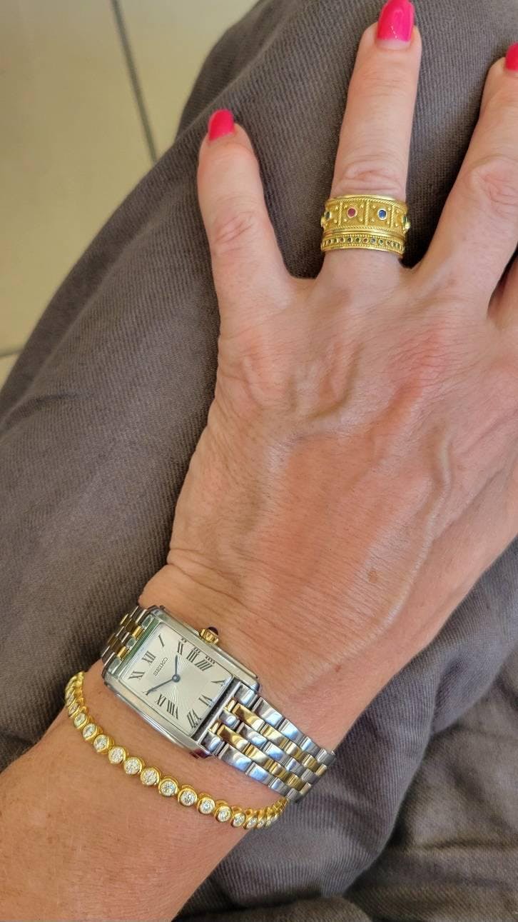 It’s a very beautiful bracelet. So shiny and well-packed! It’s dainty enough for everyday but has a lovely sparkle and shine to it. Perfect alone or stacked with other bracelets, I think!