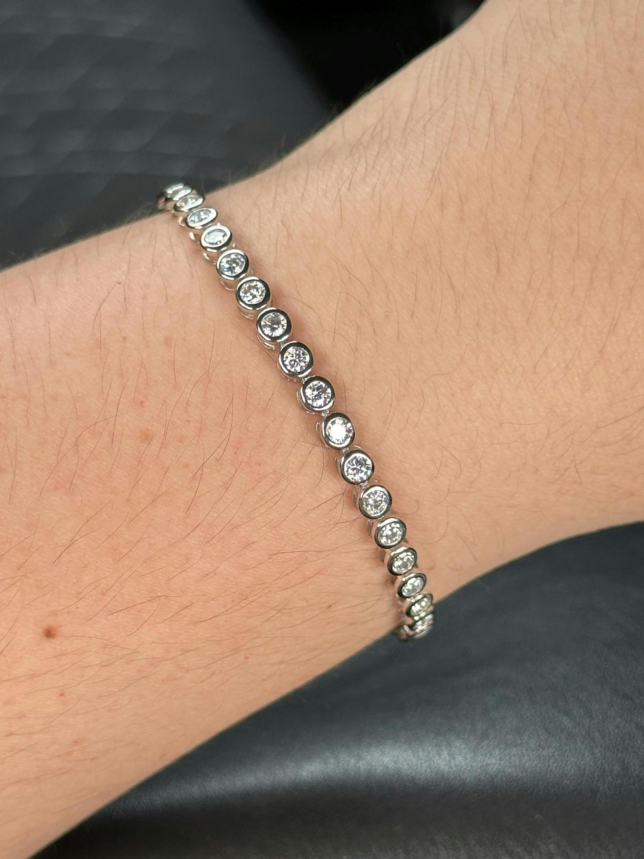 Our Certified D/VVS1 Moissanite Bezel Tennis Bracelet is a contemporary, elegant twist on the classic tennis bracelet, featuring 3mm GRA certified lab-grown moissanite set in secure bezel settings for sparkle and durability.