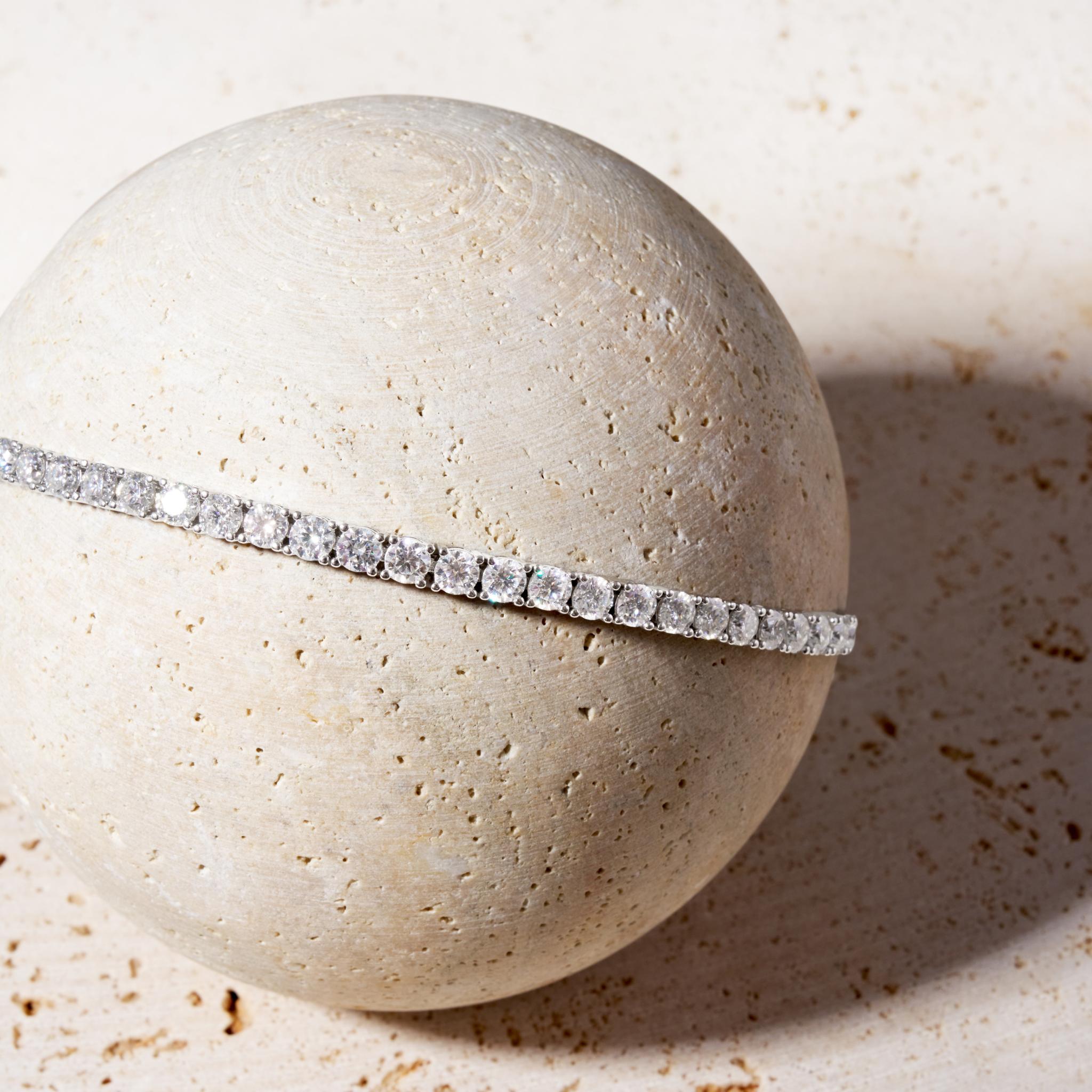 Custom-made for your perfect fit, our Tennis Bracelet is a sleek, refined take on an iconic design. Set with GRA certified lab-grown moissanite stones, each bracelet is handcrafted to your chosen length and width — ideal for everyday wear, stacking, or marking a special moment.