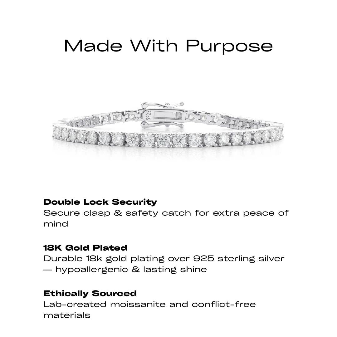 Available in 2mm, 3mm, or 4mm stone widths, it’s finished with 18k gold plating over 925 sterling silver for a brilliant, long-lasting shine. Hypoallergenic, water-resistant, and made to move with you. The 2 and 3mm are quick ship whereas the 4mm sits in a separate listing.