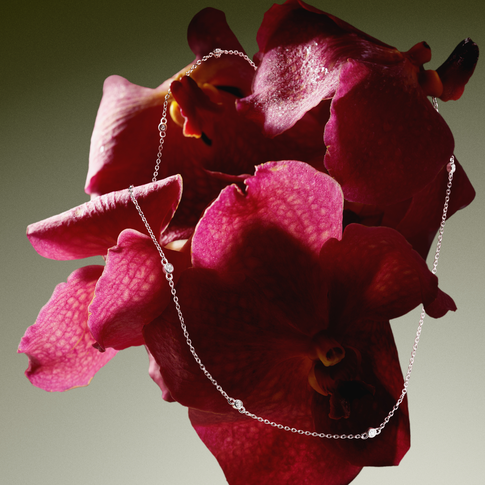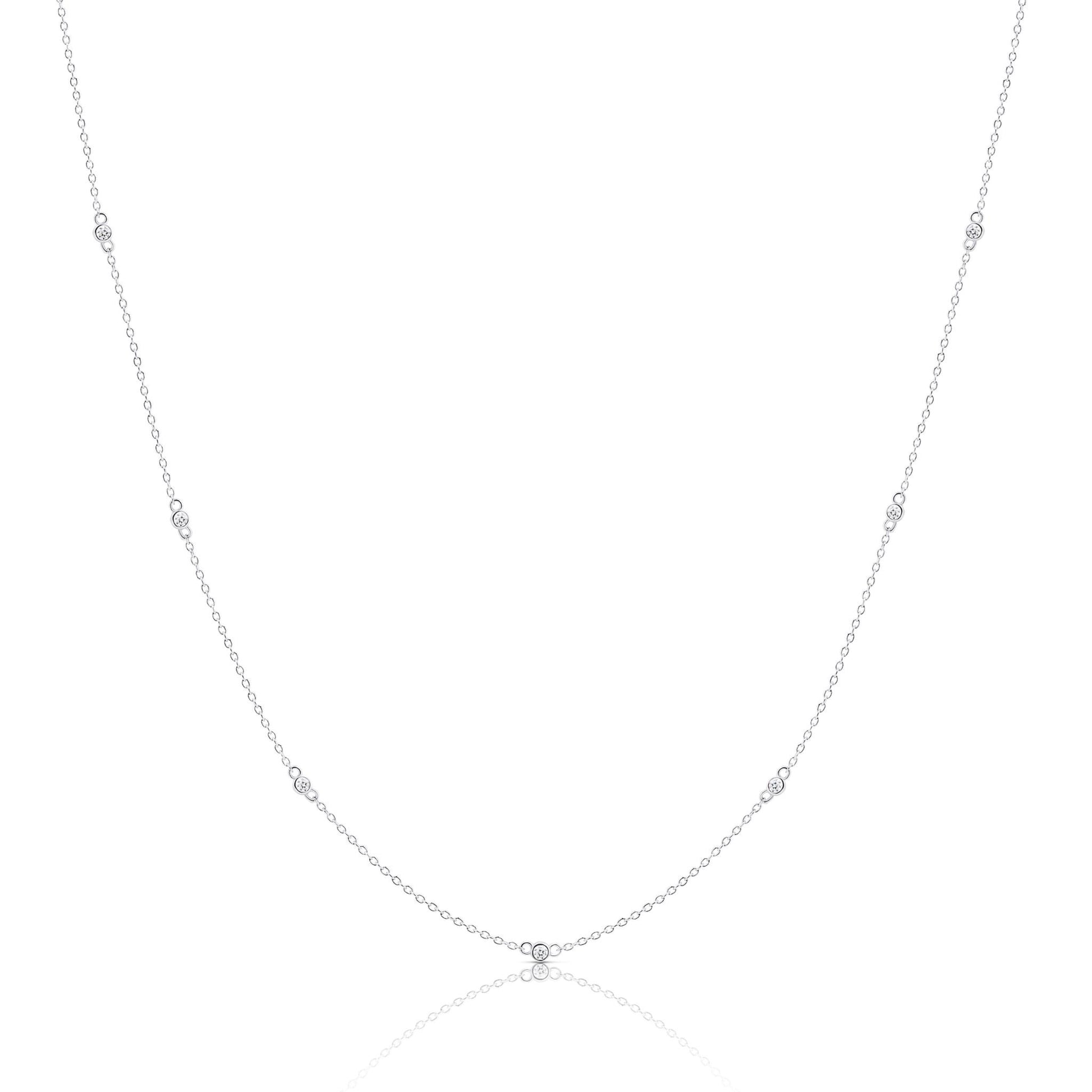 Our Bezel Necklace features 7 round lab-grown moissanite stones, with a total carat weight of .33ct, set along a delicate 925 sterling silver chain.